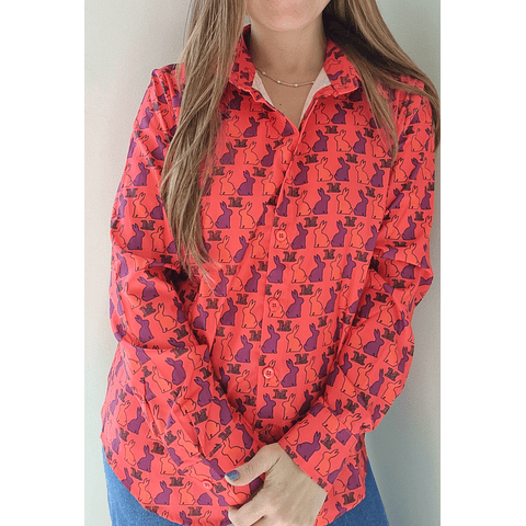 Blusa con estampado de conejos en colores rojos y morados. Siendo una prenda ideal para ocupar con cualquier ocasión.